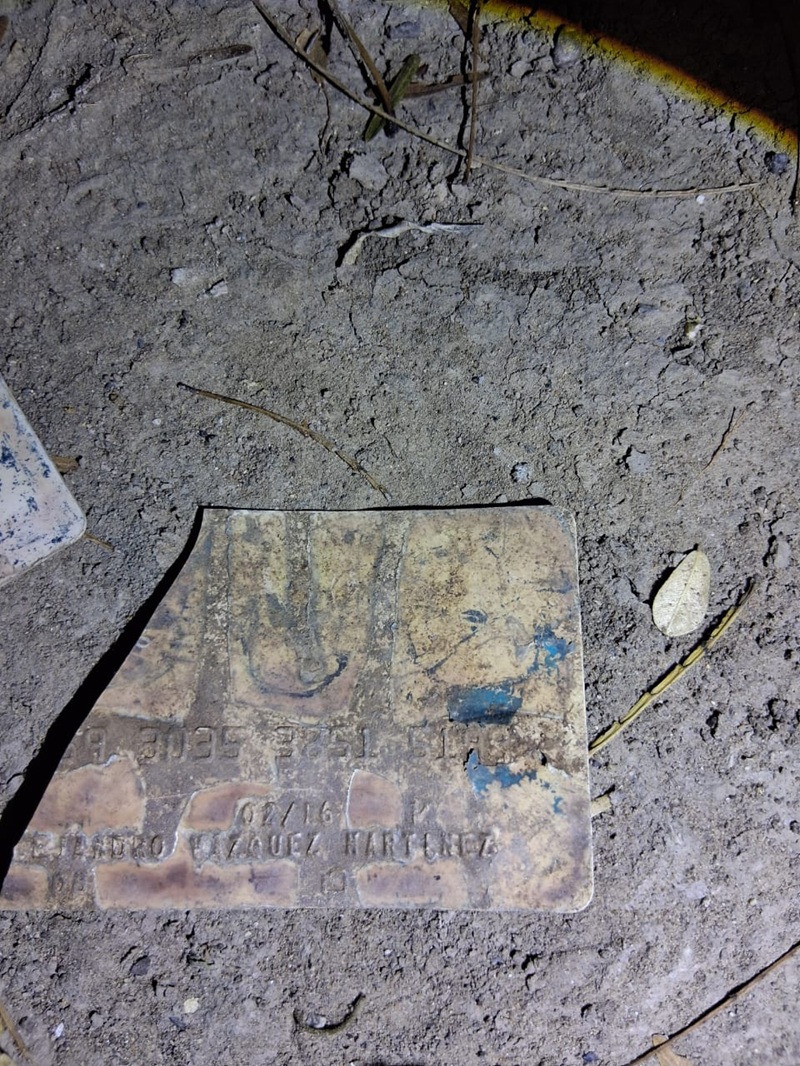 En el sitio fueron localizados un cráneo incompleto, varias costillas y una tarjeta bancaria a nombre de Alejandro Vázquez Martínez, aunque sin logotipo visible de la institución financiera. El nombre coincide con una ficha de búsqueda emitida por la Fiscalía General de Justicia del Estado el 1 de enero de 2012.