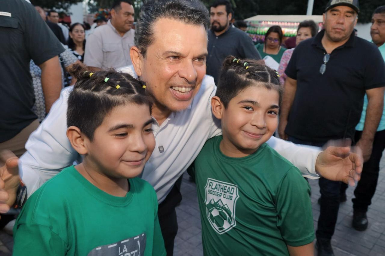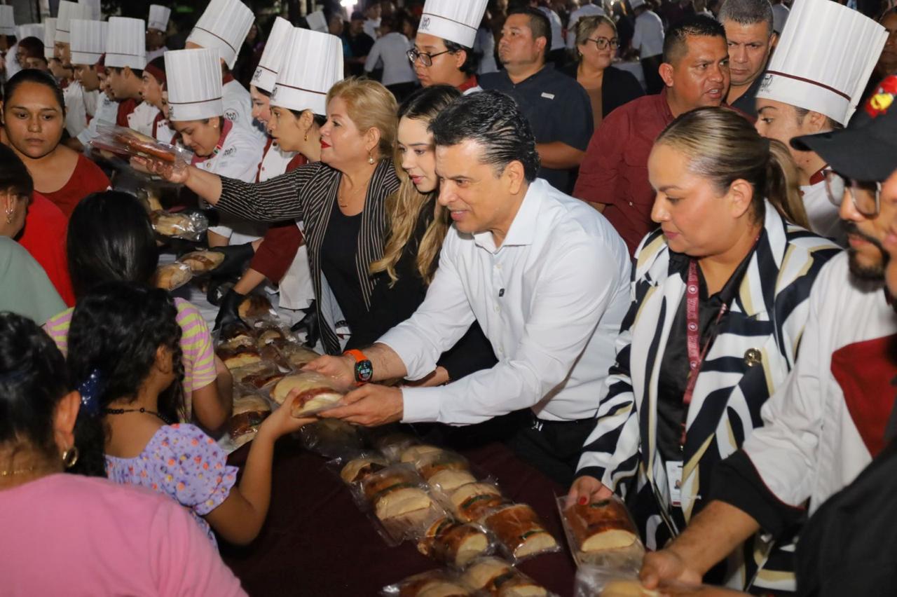 En compañía de la directora del plantel, Adriana Lizbeth Cerda Lerma, y presidentes de cámaras empresariales, compartieron el tradicional pan de la temporada entre sonrisas, abrazos y alegría de niños, jóvenes y adultos que se dieron cita en la explanada del Paseo Méndez.