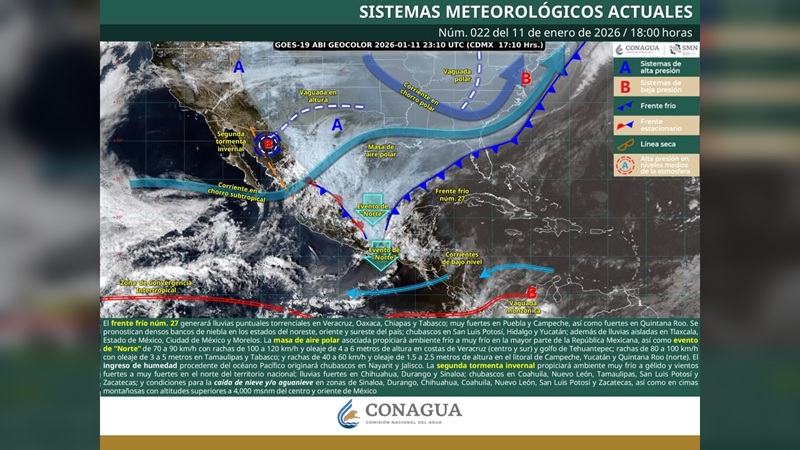 A nivel nacional, el sistema frontal ocasionará lluvias torrenciales en Veracruz, Oaxaca, Chiapas y Tabasco, así como nevadas o aguanieve en estados del norte y centro del país, mientras que el evento de Norte será prolongado en el litoral del Golfo de México.