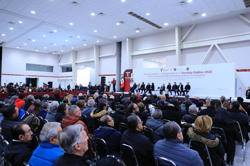 Durante la ceremonia en el Polyforum de esta capital, en la que se entregaron de manera simbólica 23 reconocimientos, medallas y estímulos económicos de un total de 1,453 a trabajadores que han cumplido entre 20 y 55 años de servicio en el Gobierno de Tamaulipas, el jefe del Ejecutivo estatal se refirió a la visita que realizó la presidenta Claudia Sheinbaum, quien trajo grandes beneficios y oportunidades para el desarrollo del estado y para seguir logrando el bienestar y la justicia social, así como coadyuvar al crecimiento y desarrollo de nuestra nación.