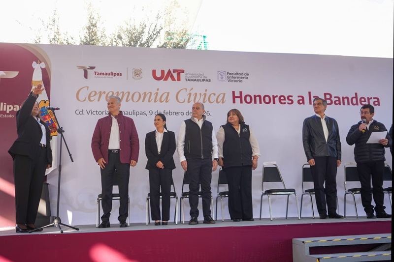 CIUDAD VICTORIA, TAMPS. El gobernador Américo Villarreal Anaya, junto con el rector de la Universidad Autónoma de Tamaulipas (UAT), Dámaso Anaya Alvarado, encabezó este lunes la ceremonia de honores a la bandera y atestiguó la toma de protesta de la Dra. María Guadalupe Vázquez Salazar como directora de la Facultad de Enfermería Victoria para el periodo 2026-2029.