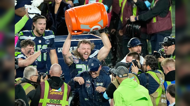 El entrenador en jefe de los Seattle Seahawks, Mike MacDonald, es bañado en líquido tras la victoria de su equipo en el partido de fútbol americano del Super Bowl 60 de la NFL contra los New England Patriots. FOTO