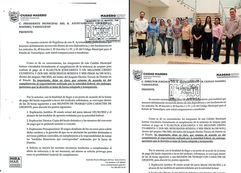 CIUDAD MADERO, TAMPS. Un bloque de diez regidores del Ayuntamiento de Ciudad Madero ha colocado en el centro del debate público un asunto que combina responsabilidad política, obligaciones laborales históricas y la fuerza vinculante de una sentencia federal: el pago de $51,142,776.36 pesos derivado de un laudo laboral y el cumplimiento del amparo 748/2025, radicado ante el Juzgado Décimo Tercero de Distrito.