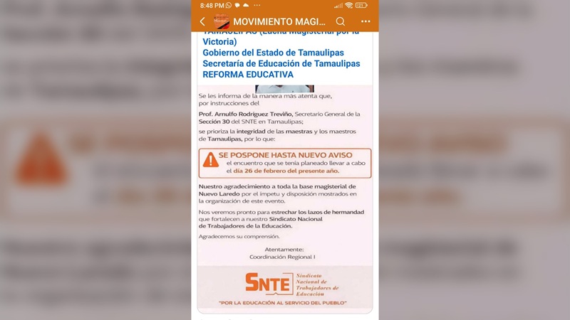 CIUDAD VICTORIA, TAMPS. El Movimiento Democrático Magisterial de Tamaulipas acusó al secretario general de la Sección 30 del SNTE, Arnulfo Rodríguez Treviño, de incongruencia al justificar con un comunicado la ausencia del dirigente nacional Alfonso Cepeda en la visita programada para el 26 de febrero, alegando “crisis de seguridad en el estado”.