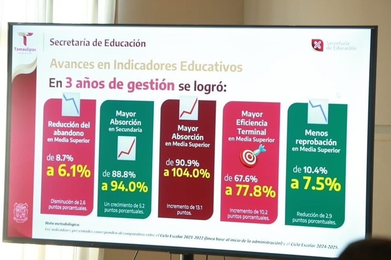 También se destacó que Tamaulipas es el único estado con cobertura del 100% por ciento de la ‘Política de Aprendizajes Fundamentales’ en 1º, 2º y 3º grado de primaria, en donde todas y todos los estudiantes cuentan con habilidades fundamentales de lectura, escritura y pensamiento lógico. Además de alcanzar el tercer lugar nacional en absorción en educación media superior y cobertura en educación superior, incluyendo posgrado.