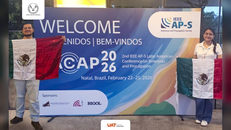 CIUDAD VICTORIA, TAMPS. Los estudiantes de la Universidad Autónoma de Tamaulipas (UAT), Ana Lucero Cruz Trejo (Ingeniería en Electrónica) y Eliud Eduardo Gallegos Magallán (Ingeniería en Sistemas de Producción), destacaron en Brasil al presentar proyectos científicos de alto impacto tecnológico. Ambos alumnos, pertenecientes a la Unidad Académica Multidisciplinaria Reynosa Rodhe (UAMRR), representaron a México en la 2.ª Conferencia Latinoamericana IEEE AP-S sobre Antenas y Propagación (LACAP 2026), celebrada en Natal, Brasil, del 22 al 25 de febrero de 2026.