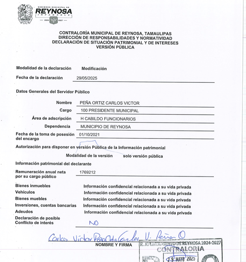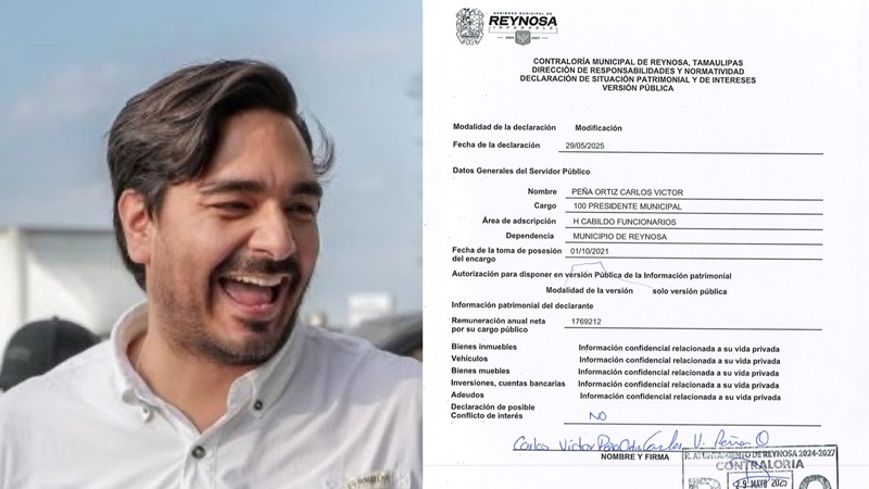 REYNOSA, TAMPS. El alcalde de Reynosa, Carlos Víctor Peña Ortiz, ha ocultado su riqueza desde que llegó al cargo hace 5 años, mientras enfrenta una denuncia por operaciones con recursos de procedencia ilícita, acusación que ha intentado evadir con amparos.