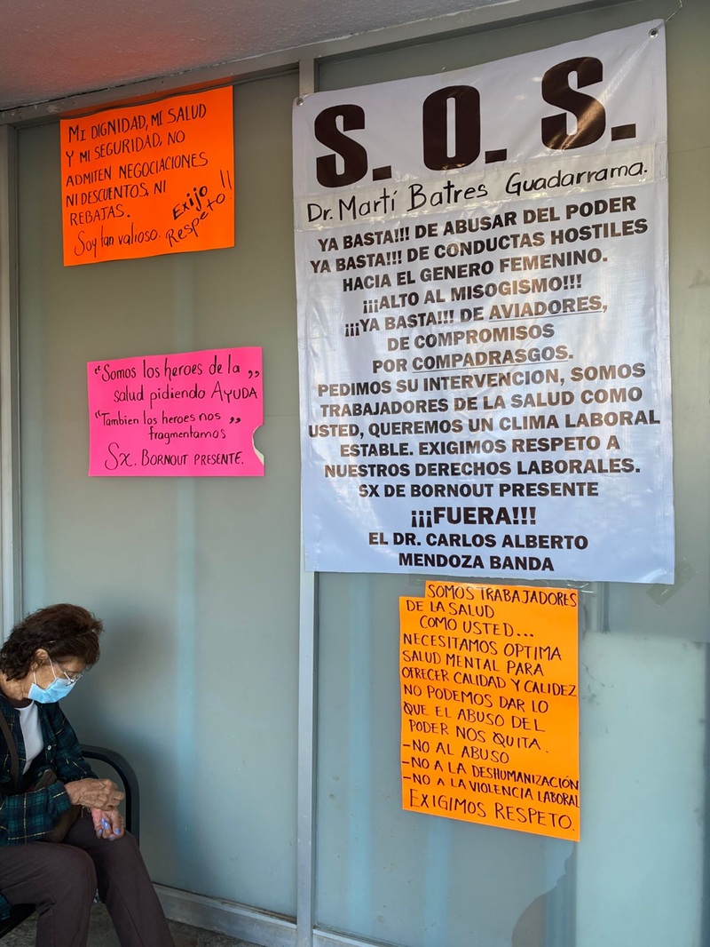 Con cartulinas y mantas colocadas en el acceso a la Clínica, se exige el cese del abuso de poder y de conductas hostiles hacia el género femenino, entre otras irregularidades.