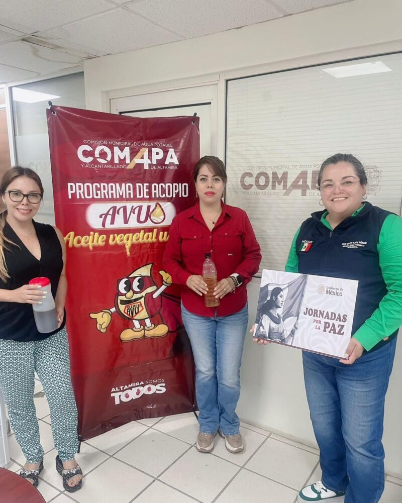 ALTAMIRA, TAMPS. En atención a las acciones orientadas en la ‘Campaña de Recolección’ de ‘Aceite Vegetal Usado’ (AVU), la Comisión Municipal de Agua Potable y Alcantarillado de Altamira, que dirige el Dr. Gabriel Arcos Espinosa, recibió el acopio de este residuo por parte de la Secretaría Técnica Regional de la Secretaría de Gobernación.