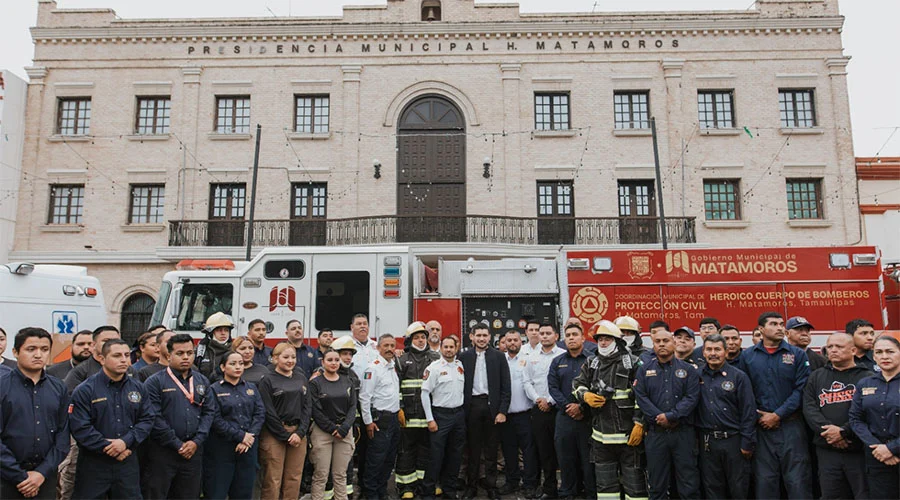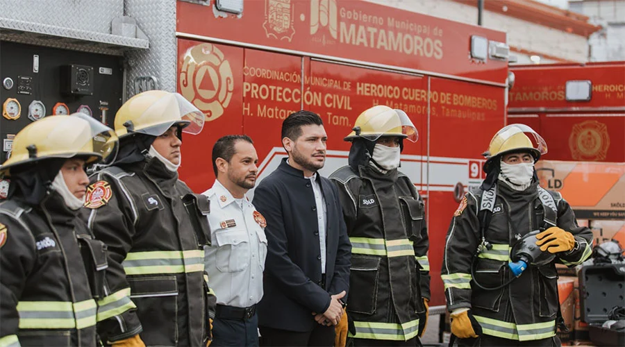 Matamoros, Tamps. El alcalde de Matamoros, Beto Granados, en un acto de justicia para el Heroico Cuerpo de Bomberos, hizo entrega de equipo personal, cuatro unidades de motobomba y una ambulancia donada por la empresa Orbia, que en conjunto suman más de 8 millones de pesos. Además, anunció un incremento salarial del 30 por ciento para todo el personal de Protección Civil.