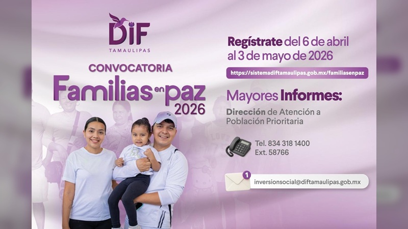 Las iniciativas deben ser presentadas en línea, teniendo como fecha límite el 3 de mayo del presente año, cumpliendo con los documentos y especificaciones indicadas en la convocatoria, disponible en la página https://sistemadiftamaulipas.gob.mx/familiasenpaz/.